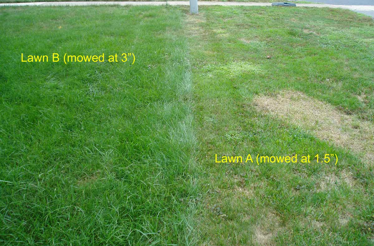 During summer heat, it is best to increase the deck height on your lawn mower. It is recommended, for Connecticut lawns, to mow at a height of 2.5-3 inches (from the ground) during the summer. Avoid removing more than a third of the grass height. This may require the lawn to be mowed more often, but will help encourage a healthier lawn. The heat of the summer cause grass growth to slow down. A tall, dense lawn helps keep the soil cool and moist during the summer. Tall grass will also help prevent your lawn from burning. A slight browning of the lawn is typical as it goes dormant to protect itself against extreme heat.
